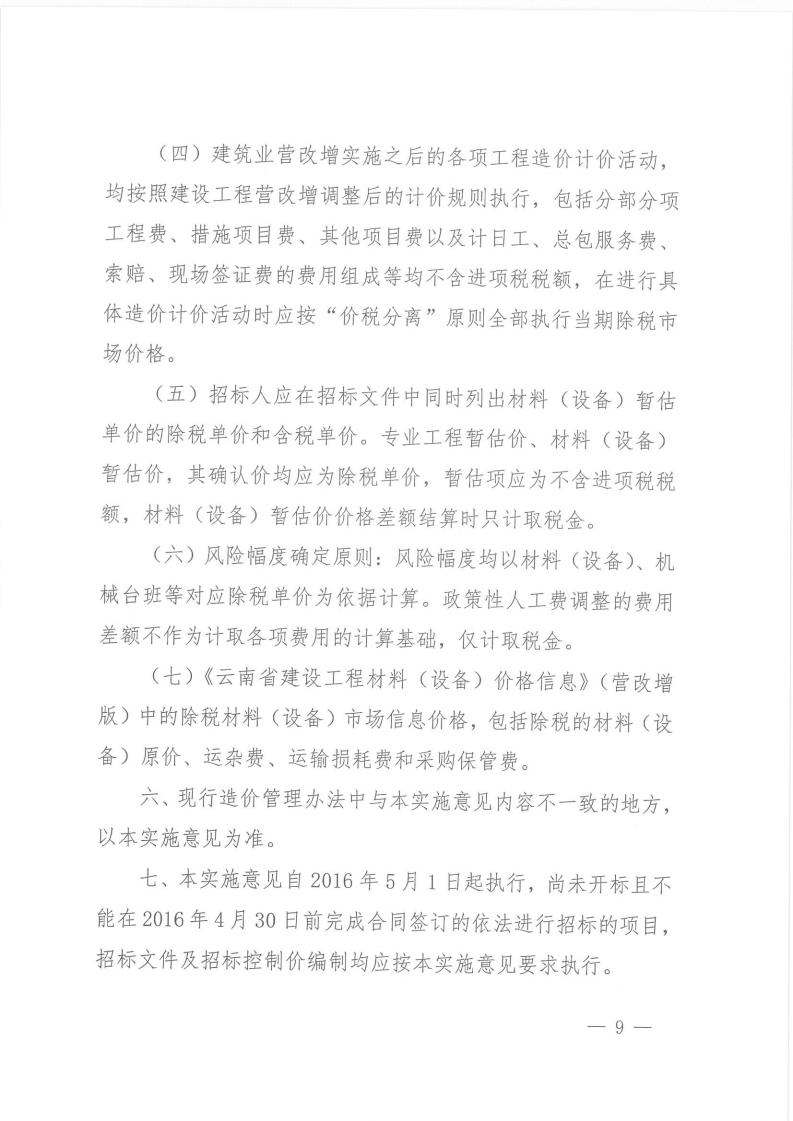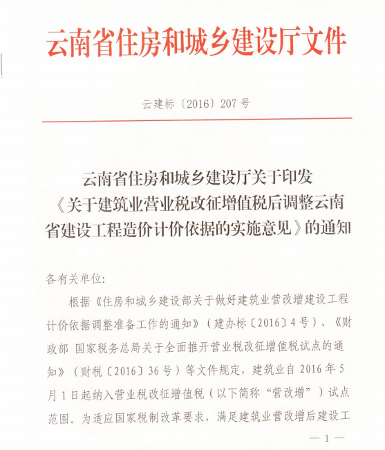 關(guān)于建筑業(yè)營業(yè)稅改征增值稅后調(diào)整云南省建設(shè)工程造價(jià)計(jì)價(jià)依據(jù)的實(shí)施意見的通知 云建標(biāo)[2016]207號(hào)