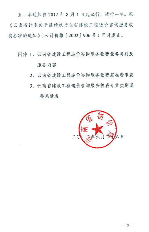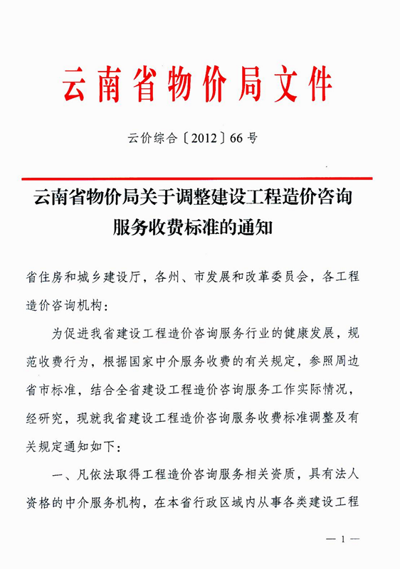 云南省物價(jià)局關(guān)于調(diào)整建設(shè)工程造價(jià)咨詢服務(wù)收費(fèi)標(biāo)準(zhǔn)的通知 云價(jià)綜合[2012]66號(hào)