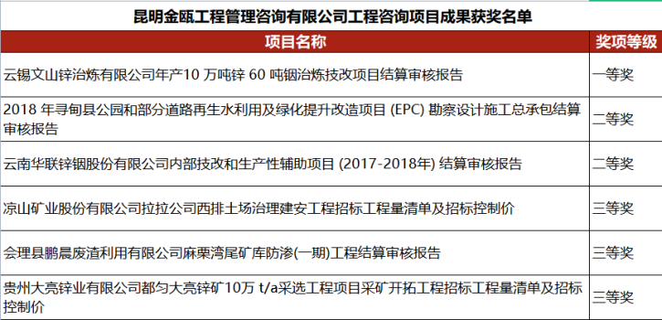 關于中國有色金屬建設協(xié)會發(fā)布《關于公布2022年度有色金屬建設行業(yè)工程咨詢、勘察、設計及信息技術成果評價結果的通知》,昆明金甌工程管理咨詢有限公司(以下簡稱昆明金甌)6項工程咨詢項目獲獎,其中1項成果為一等獎,2項成果為二等獎,3項成果為三等獎。