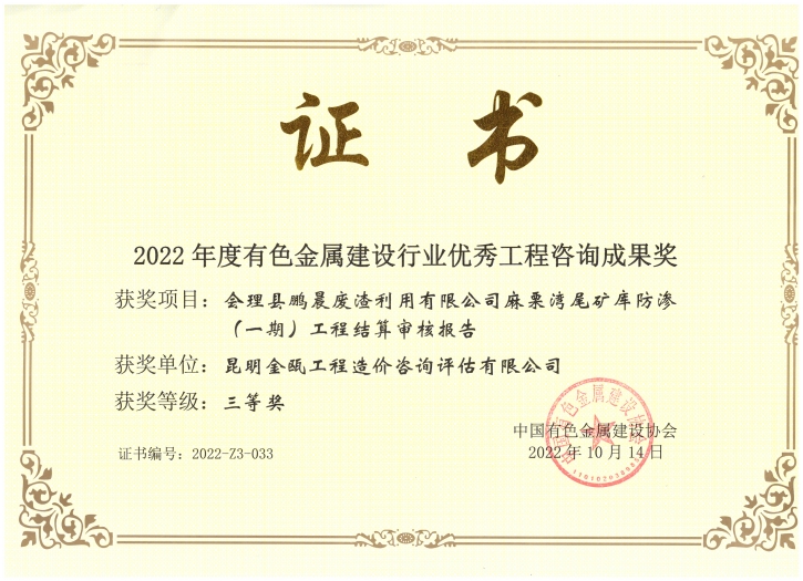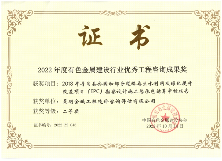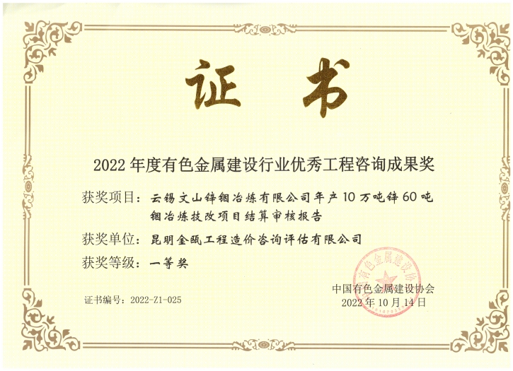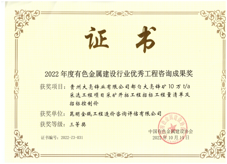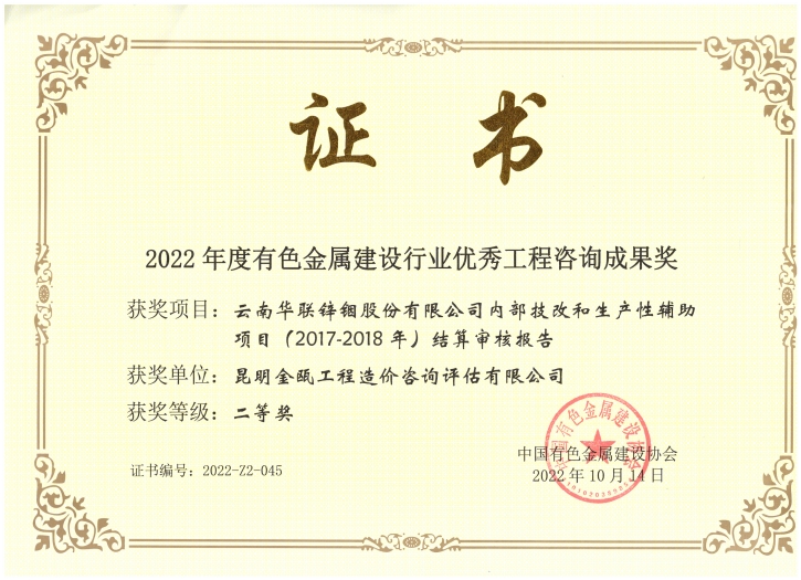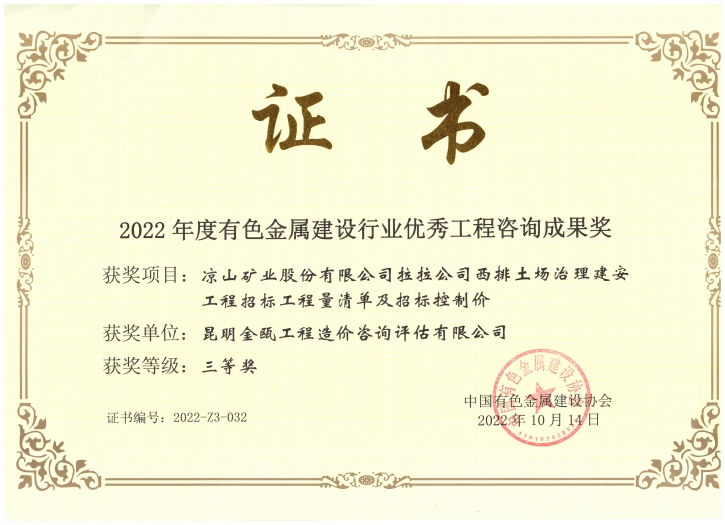 昆明金甌工程管理咨詢有限公司在2022年度有色金屬建設行業(yè)獲獎情況
