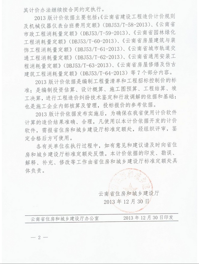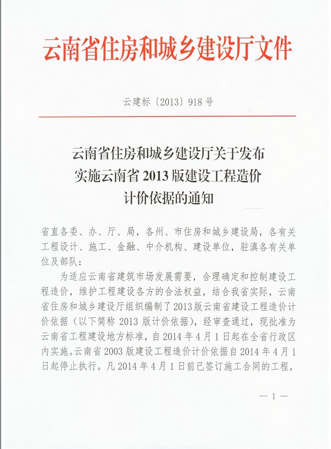 云南省住房和城鄉(xiāng)建設(shè)廳關(guān)于發(fā)布實(shí)施云南省2013版建設(shè)工程造價(jià)計(jì)價(jià)依據(jù)的通知