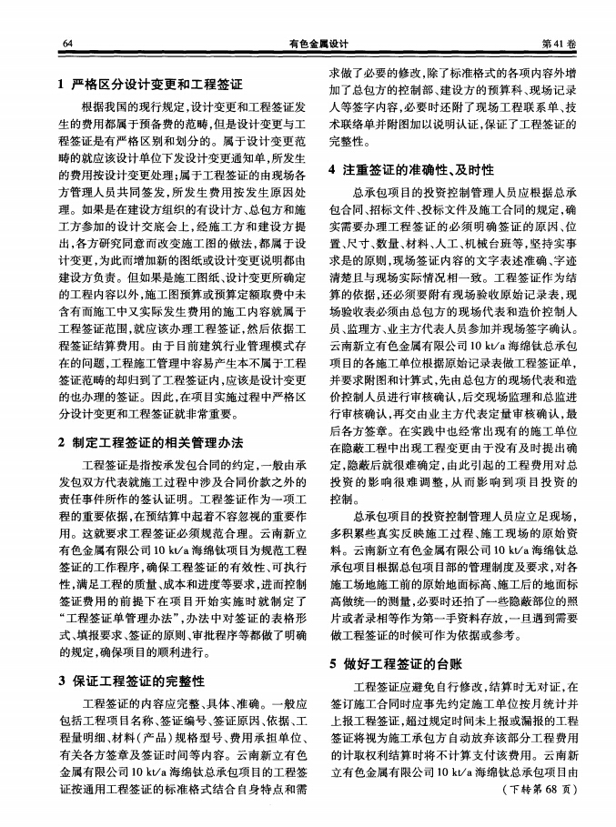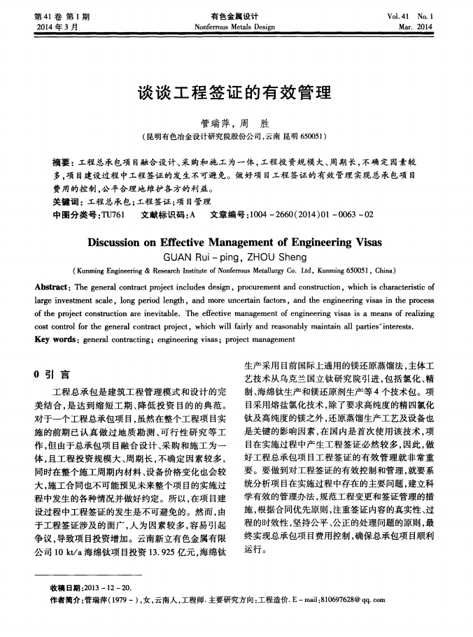 熱烈慶祝我公司工程師發(fā)表的論文《談?wù)劰こ毯炞C的有效管理》入選《有色金屬設(shè)計》雜志2014年1期,交流在工藝、技術(shù)、控制、工程簽證等方面,工程造價的有效管理和造價控制運行經(jīng)驗,推動行業(yè)技術(shù)進步和持續(xù)健康發(fā)展。
