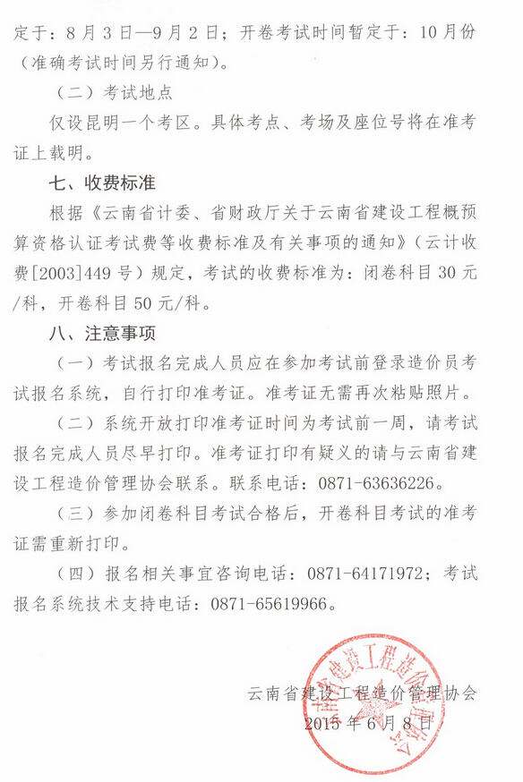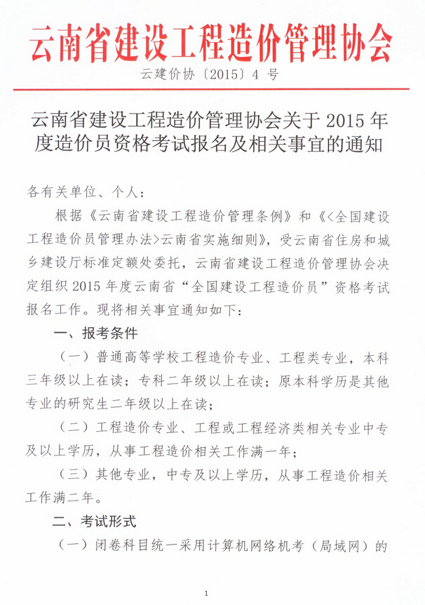 云南省建設(shè)工程造價(jià)管理協(xié)會關(guān)于2015年度造價(jià)員資格考試報(bào)名及相關(guān)事宜的通知
